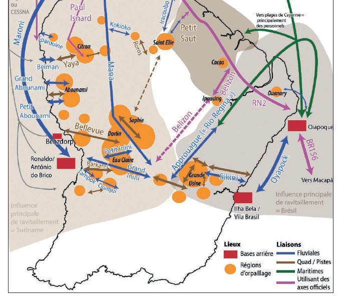 - Passage par le Sud en récupérant la piste de saut sonnelle, traversée dégrad en amont dégrad papa constant puis récupération des pistes en direction du Maroni.